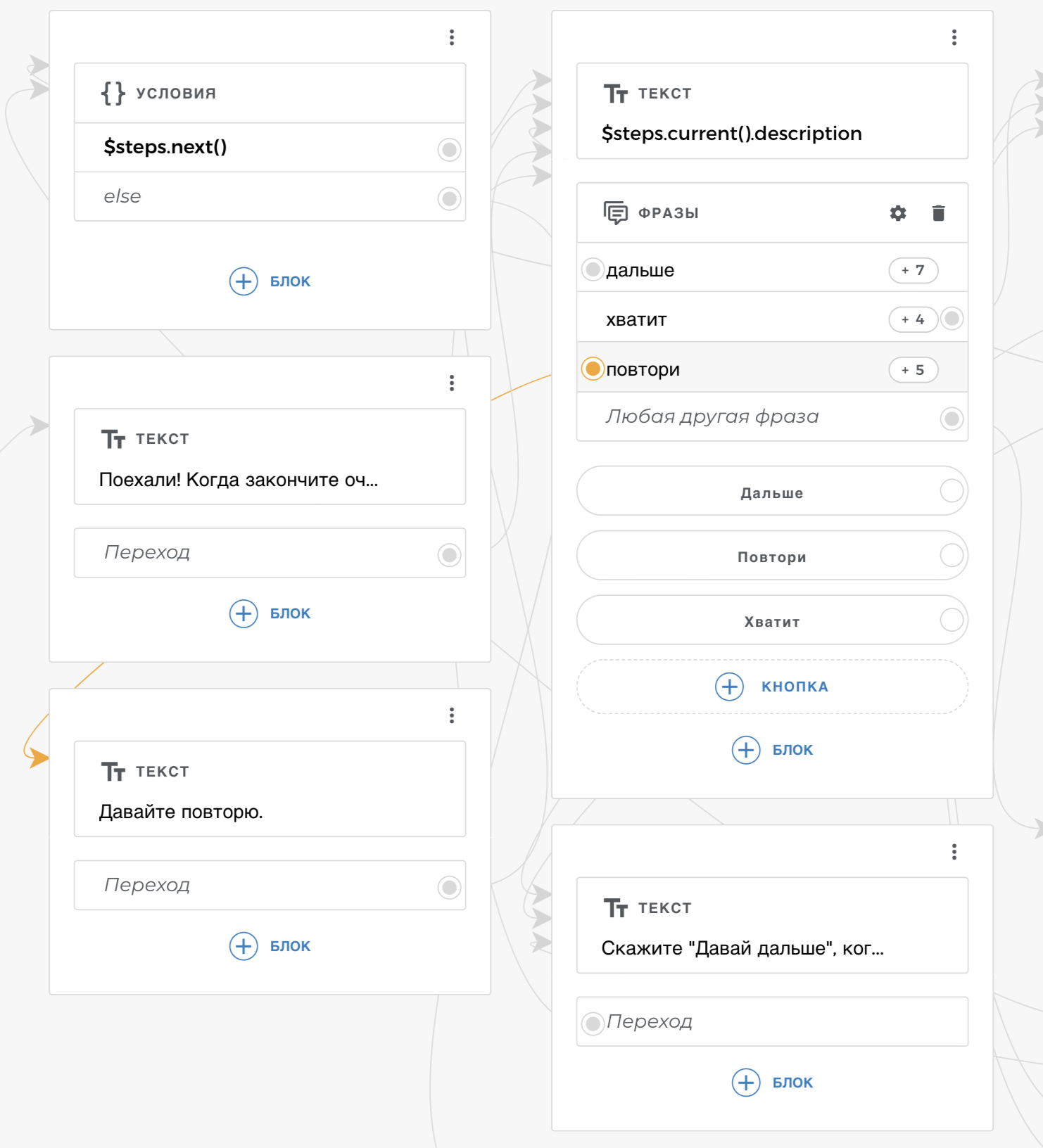 В “Йоге для глаз” мы сделали так, чтобы ассистент мог всегда повторить упражнение, если пользователь попросит. Причем не просто вывести текст упражнения заново, а в разговорной манере предложить сделать упражнение еще разок. Для этого мы использовали несколько вариаций фразы “Повтори” в блоке Фразы и поставили еще один бабл с текстом перед тем, как повторить текст упражнения.