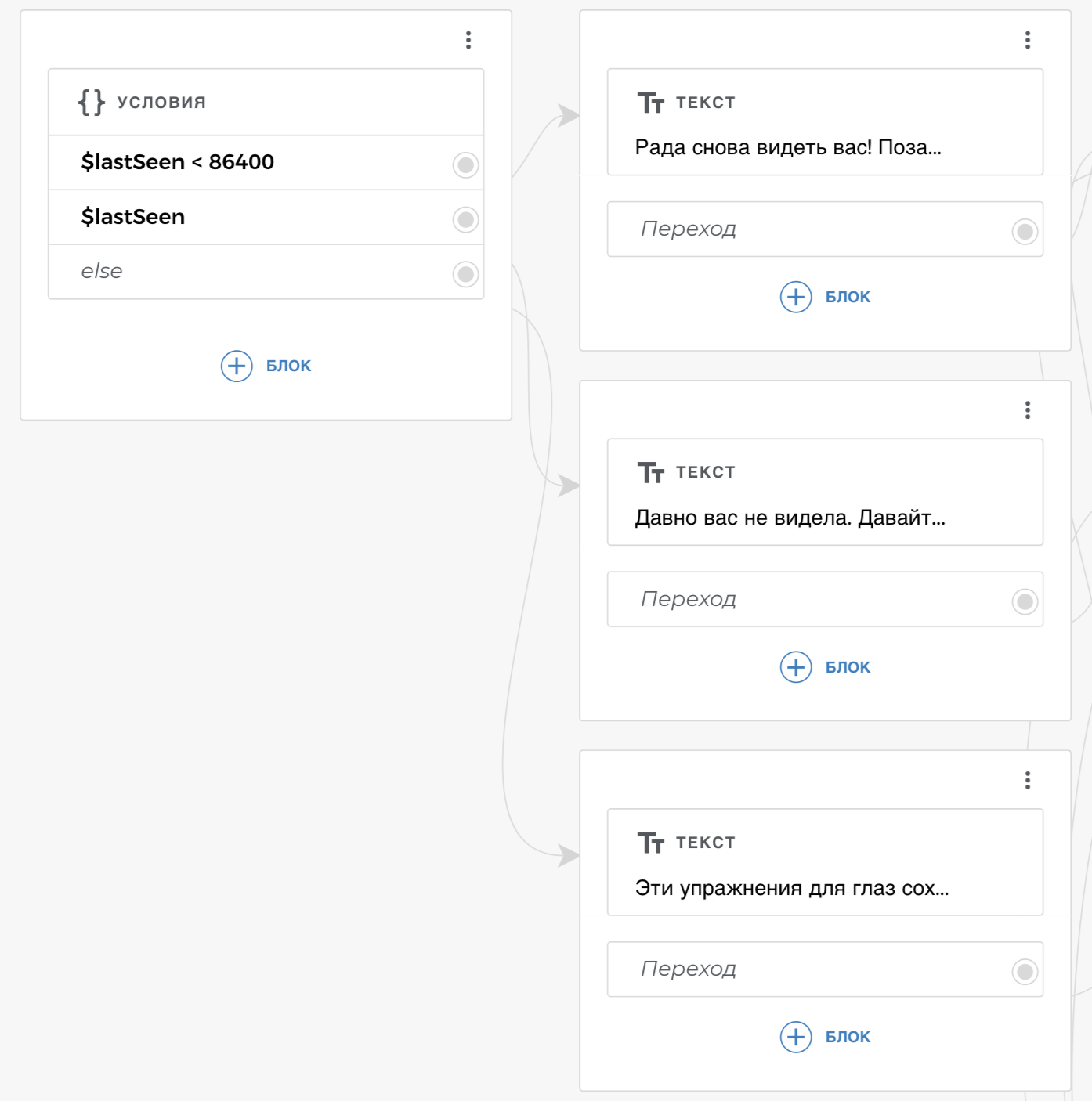 В Aimylogic есть информация о том, сколько времени назад пользователь обращался к приложению в прошлый раз. “Йога для глаз” использует это, чтобы по-разному приветствовать пользователя при запуске. А так как зарядкой нужно заниматься каждый день, то наше приложение напоминает об этом, если пользователь давно не запускал приложение. Для этого мы используем блок Условия, в котором проверяем, сколько времени назад мы получали предыдущий запрос. В зависимости от этого Action идет по разным веткам диалога.