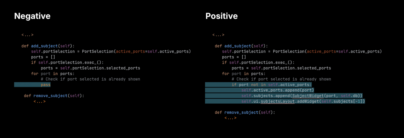 Пары дополнений на основе правил: берутся реальные примеры из предыдущего набора данных, но намеренно ухудшаются. Осмысленный код заменяется популярными заполнителями типа pass, TODO и комментариями .