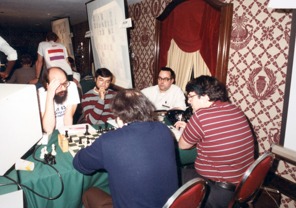 Belle сражается с Chess 4.0 на 4-м Чемпионате мира по компьютерным шахматам (WCCC), проводившемся в Нью-Йорке в 1983 году. На заднем плане слева направо: Кен Томпсон, Фредерик Фриндел и Джо Кондон. На переднем плане слева направо: разработчики Chess Дэвид Слейт и Уильям Бланчард. Турнир выиграла работавшая на суперкомпьютере шахматная программа Cray Blitz, второе место заняла Bebe.