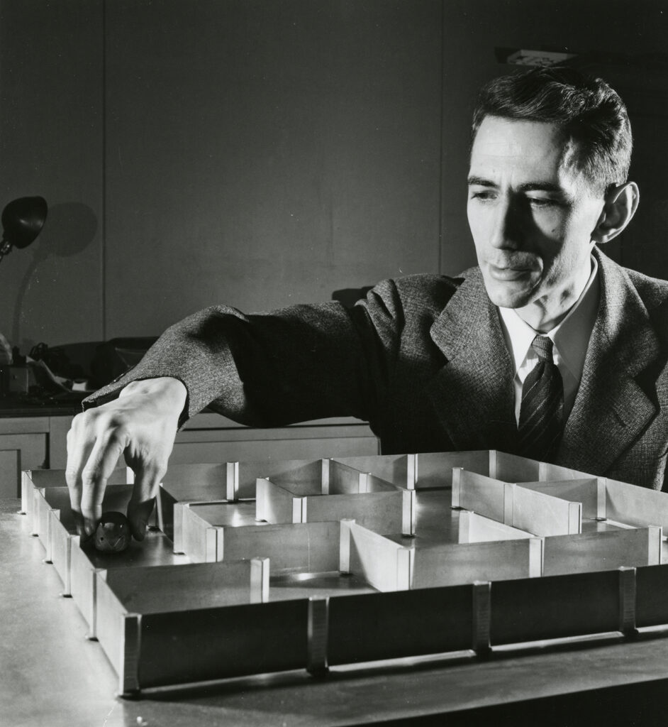 Клод Шеннон передвигает свою электрическую мышь в лабиринте (прибл. 1952 год).