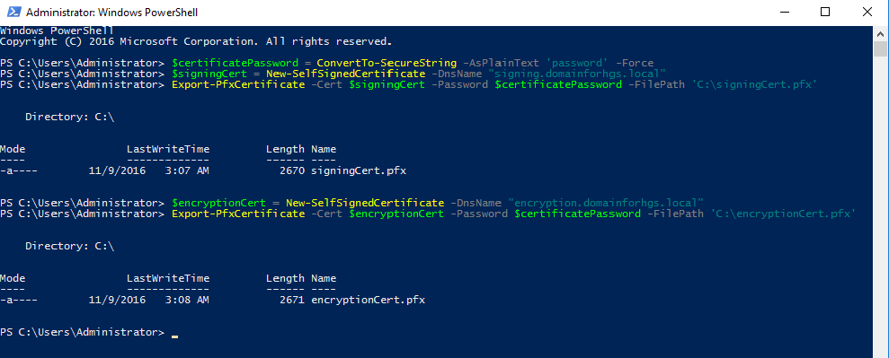 Export-PfxCertificate -Cert $signingCert -Password $certificatePassword -FilePath 'C:signingCert.pfx'