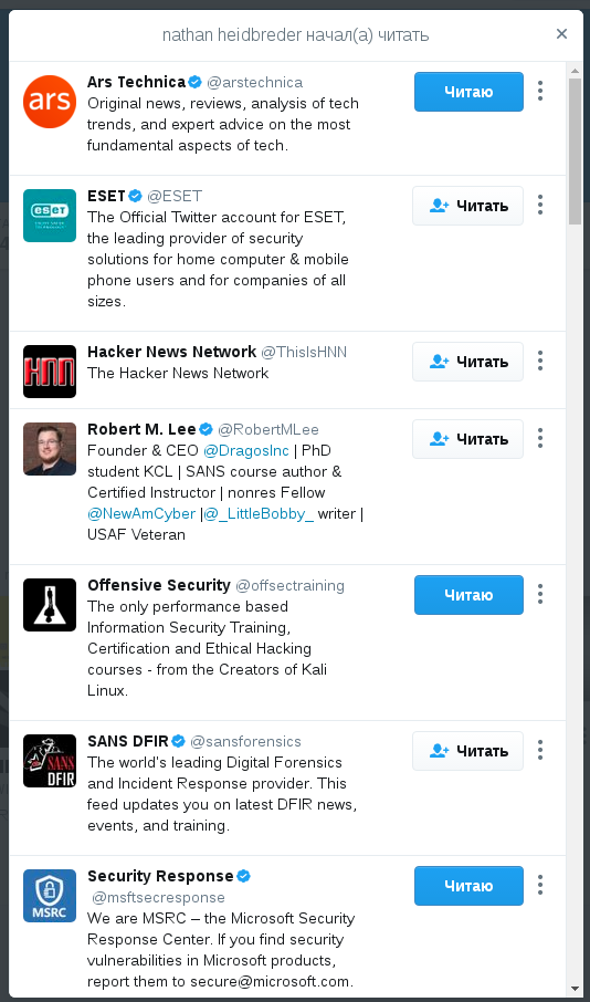 Подписки пользователя в Twitter: