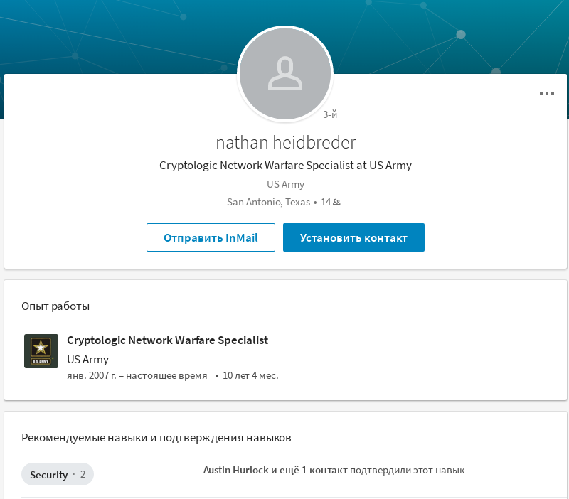 В социальной сети LinkedIn зарегестрирован акканут, совпадающий по признакам на рассматриваемого сотрудника: nathan heidbreder, специальность значится как «Cryptologic Network Warfare Specialist at US Army».