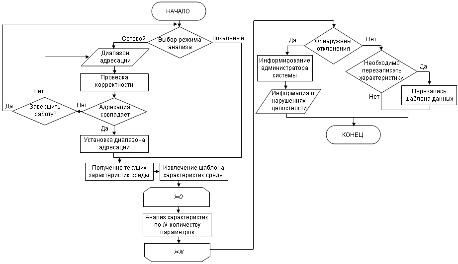 При наличии сетевого окружения можно задать диапазон адресов сети. Важным условием является доменная структура сети и наличие учетной записи администратора и его пароля. При локальном режиме происходит анализ информации на ЭВМ пользователя. Анализ информации производится N раз, при, где N – количество классов Win32_(*). При отсутствии нарушений и необходимости обновления «идеальных» характеристик, система обновляет информацию в базе данных. Необходимость обновления определяется администратором системы. Шаблонный алгоритм может представлять следующий набор операций:
