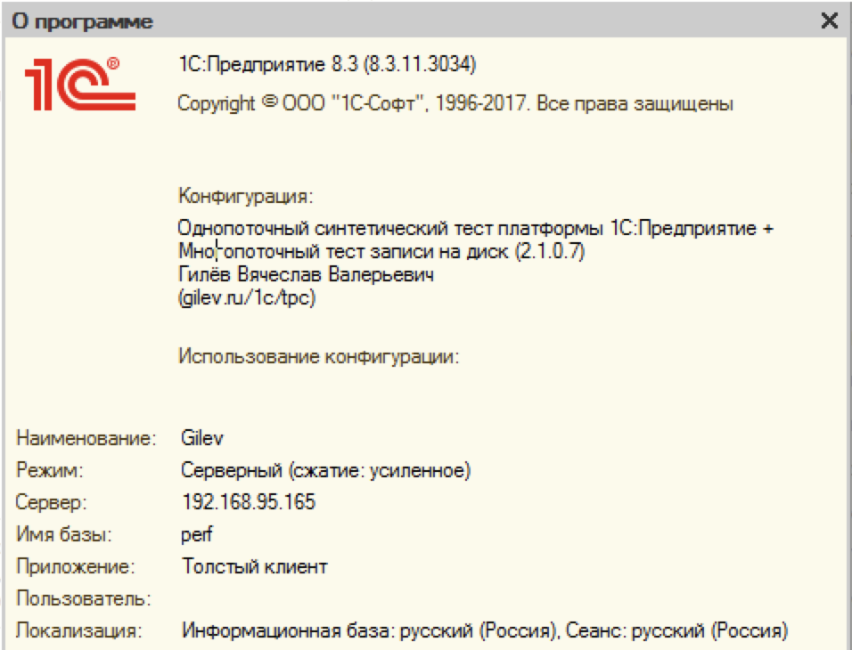 Вход в базу perf можно выполнить без пароля, пользователь по умолчанию обладает правами администратора. После входа в базу выясняется, что она содержит конфигурацию «Нагрузочный тест TPC-1C», предназначенную для тестирования производительности сервера 1С.