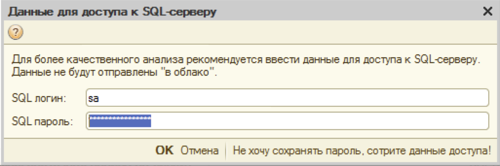 Предположим, что учетные данные для подключения к серверу баз данных не сохранены в информационной базе или была обнаружена вовсе пустая база без конфигурации. Что тогда, спросите Вы?