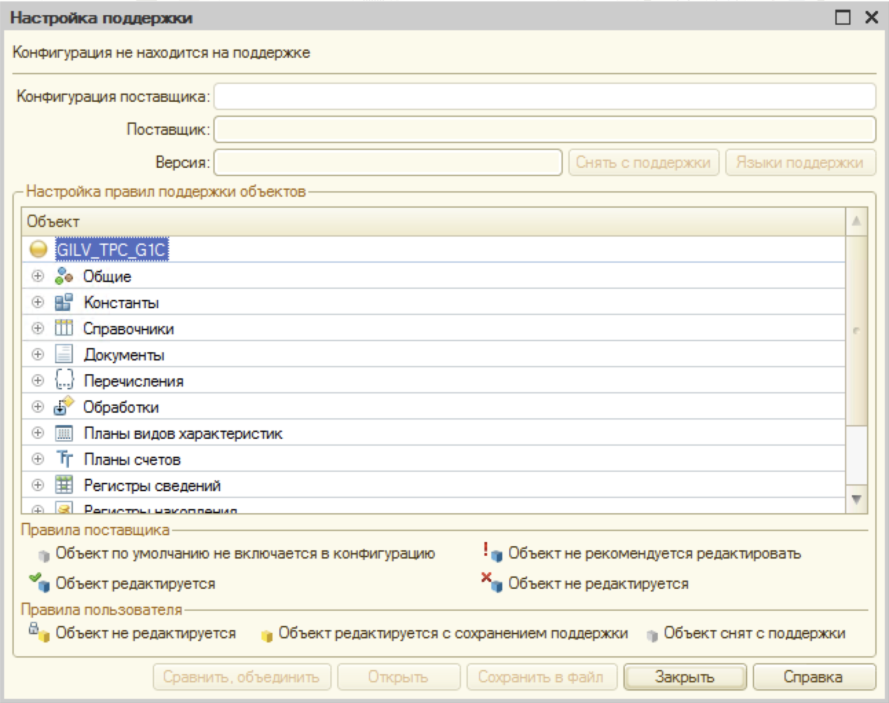Мы столкнулись с проблемой, пароль скрыт. Не придумав решения лучше, было решено просто отключить свойство «РежимПароля» для поля «SQL пароль». Для этого открыли информационную базу в режиме конфигуратора. С помощью следующей схемы «Конфигурация -> Поддержка -> Настройка поддержки» сняли конфигурацию с поддержки, чтобы появилась возможность изменить форму в конфигурации: