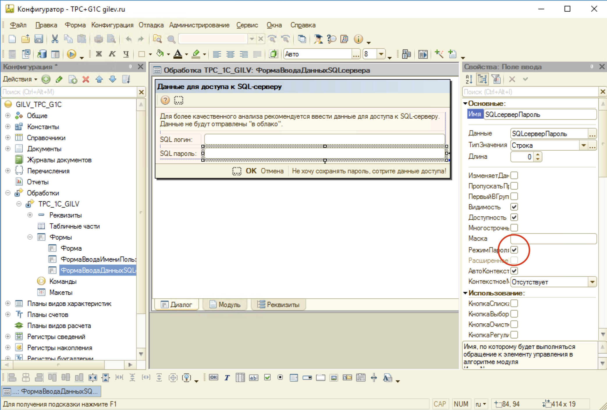 Далее нашли форму с отображением учетных данных и отключили свойство «РежимПароля» для поля «SQL пароль»: