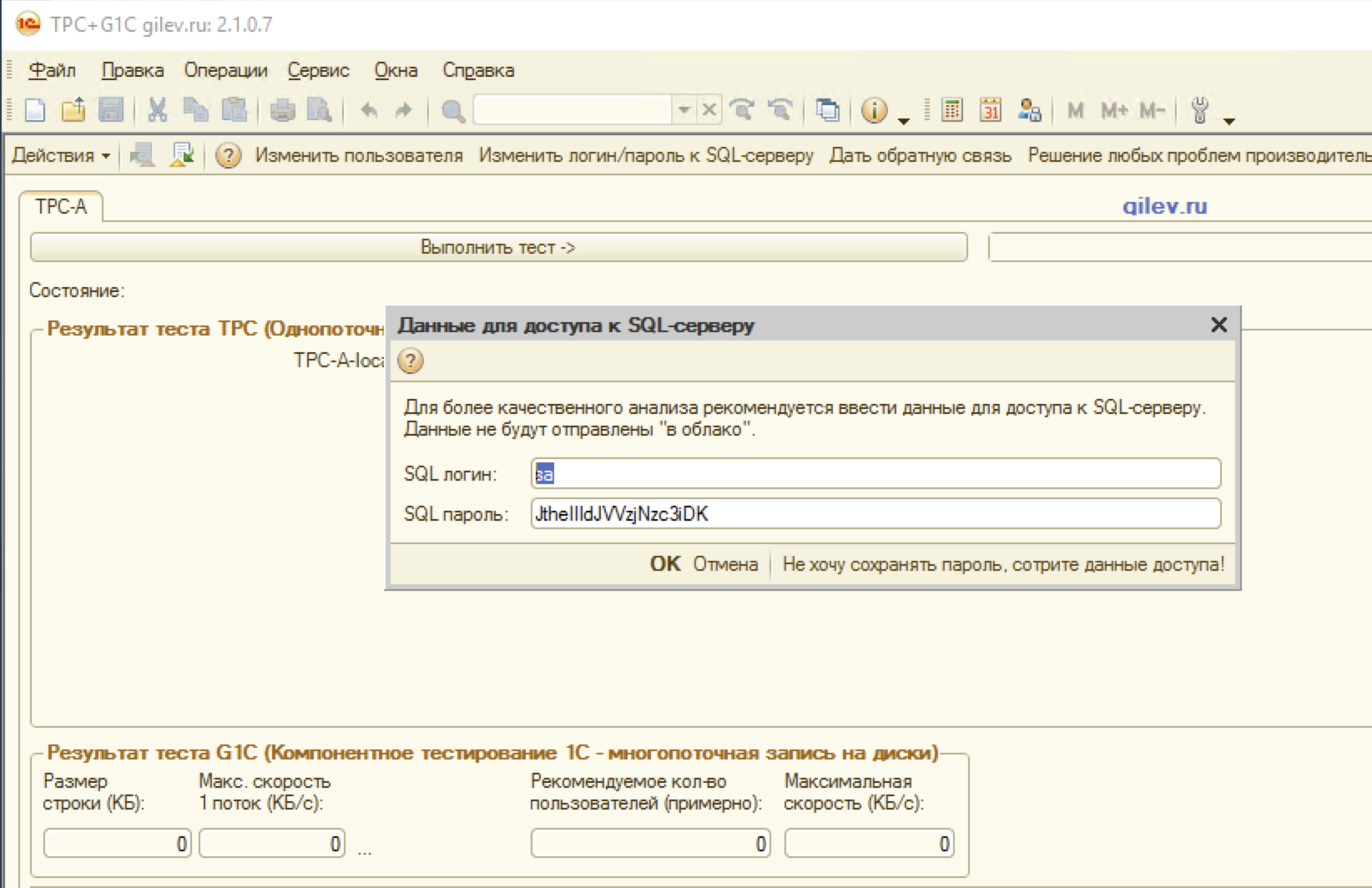 В конфигурации для тестирования производительности требуется указать учетные данные для подключения к серверу баз данных. Учетные данные сохраняются в информационной базе. В нашем случае так и произошло, системный администратор не удалил учетные данные после выполнения тестов производительности:
