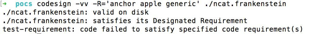 Для файла ncat.frankenstein Fat/Universal не отображается, что код действителен. Таким образом, я не могу рекомендовать spctl для ручной проверки автономных двоичных файлов Mach-O. Просто используйте codesign с соответствующими флагами.