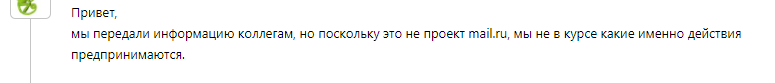 Отчёт с подробностями был отправлен в 00:20. Примерно в 00:43 в отчёте мне ответил глава информационной безопасности в компании mail.ru Сергей Белов. Он попросил прекратить пост эксплуатацию моей blind xss и немедленно выйти с админ панели, что я, естественно, и сделал.