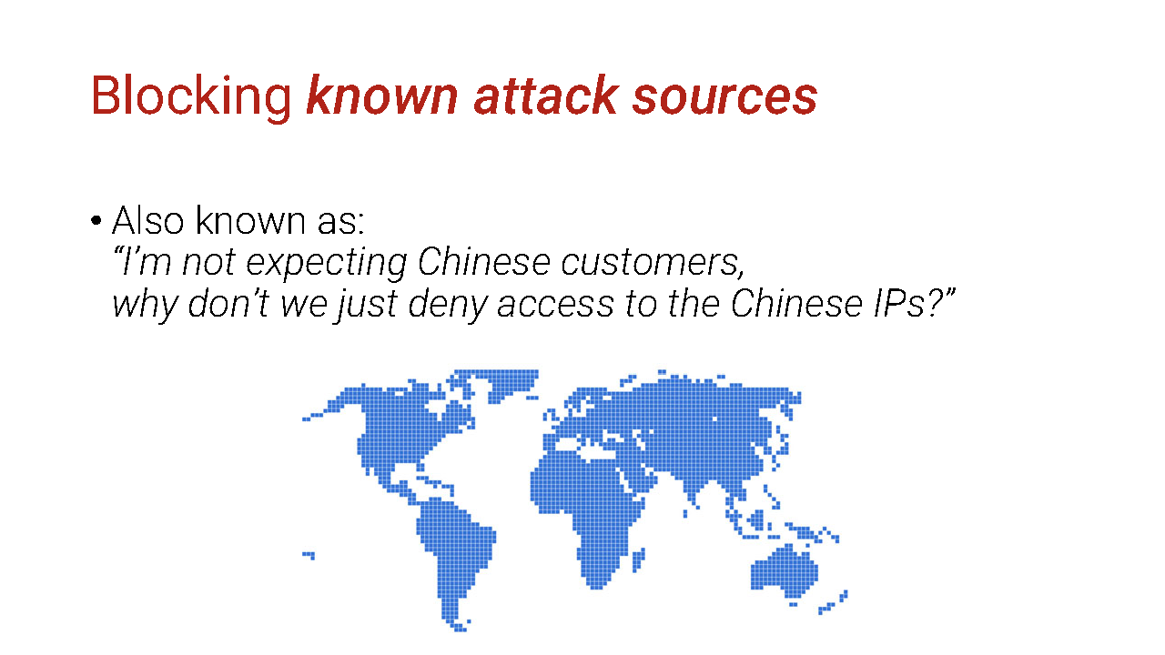 Допустим мы, как компания, не ожидаем Испанскую Инквизицию, тьфу, китайских пользователей. Почему бы нам просто не ограничить доступ с их IP-адресов? Мы не Facebook в конце концов, да и услуги наши доступны лишь в ограниченном количестве регионов. Да и, собственно, Facebook тоже недоступен в Китае, нам-то чего волноваться?