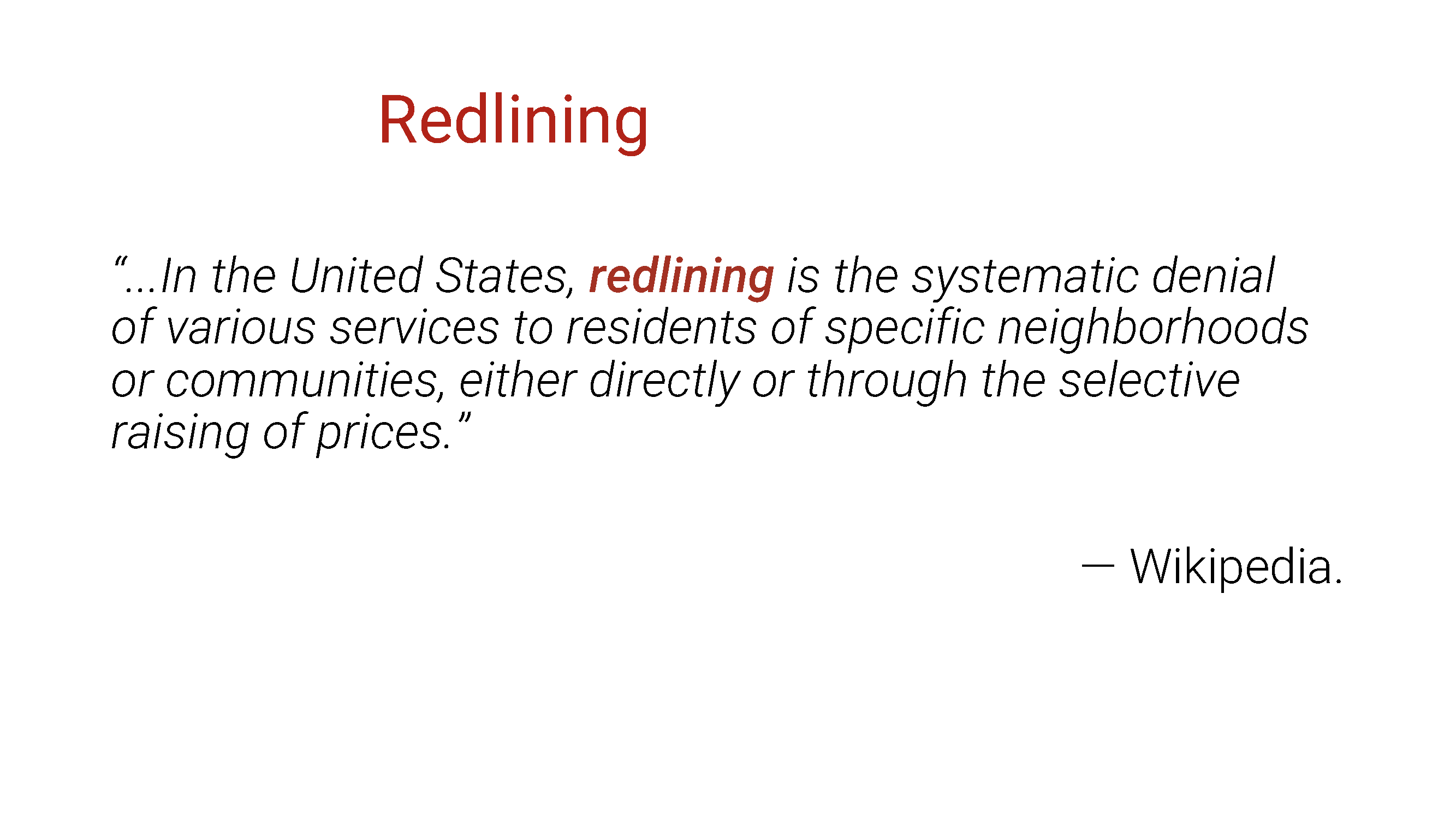 Допустим, вы — директор таксопарка или пиццерии. Вы накопили определённую статистику, что в некоторых районах города могут ограбить вашего курьера, или же высока вероятность, что вашу машину поцарапают. Что ж, вы собираете все сотрудников, при них рисуете на карте города жирную красную линию и объявляете, что за пределами красной границы вы больше услуги не предоставляете. (Ввиду особенностей строения большинства американских городов это, кстати, практически эквивалентно отказу в услугах по этническому принципу и считается большой проблемой.)