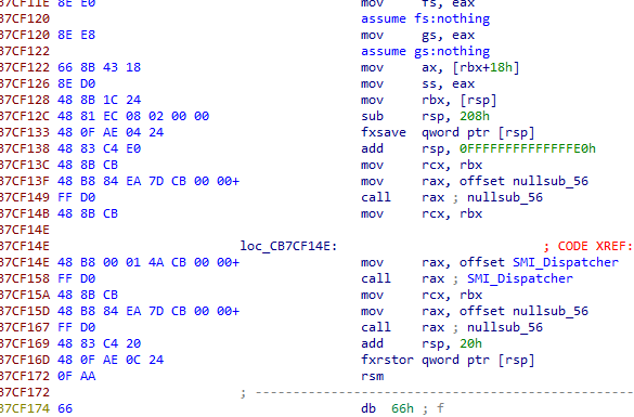Нам бы не хотелось писать 16-битный код или подготавливать все необходимое для переключения в 64-битный режим самостоятельно, так что мы разместим наш перехватчик прямо перед вызовом функции диспетчера SMI (эта функция определяет, какому SMM модулю нужно передать исполнение в зависимости от того, какой сервис был вызван или какое событие произошло).