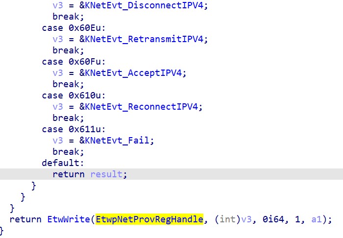 Таким образом, поток родительского процесса является прямым инициатором создания события ETW. Примерно таким же образом работает запись остальных событий, например, сетевых. Ниже приведен пример создания событий, связанных с сетевой активностью: