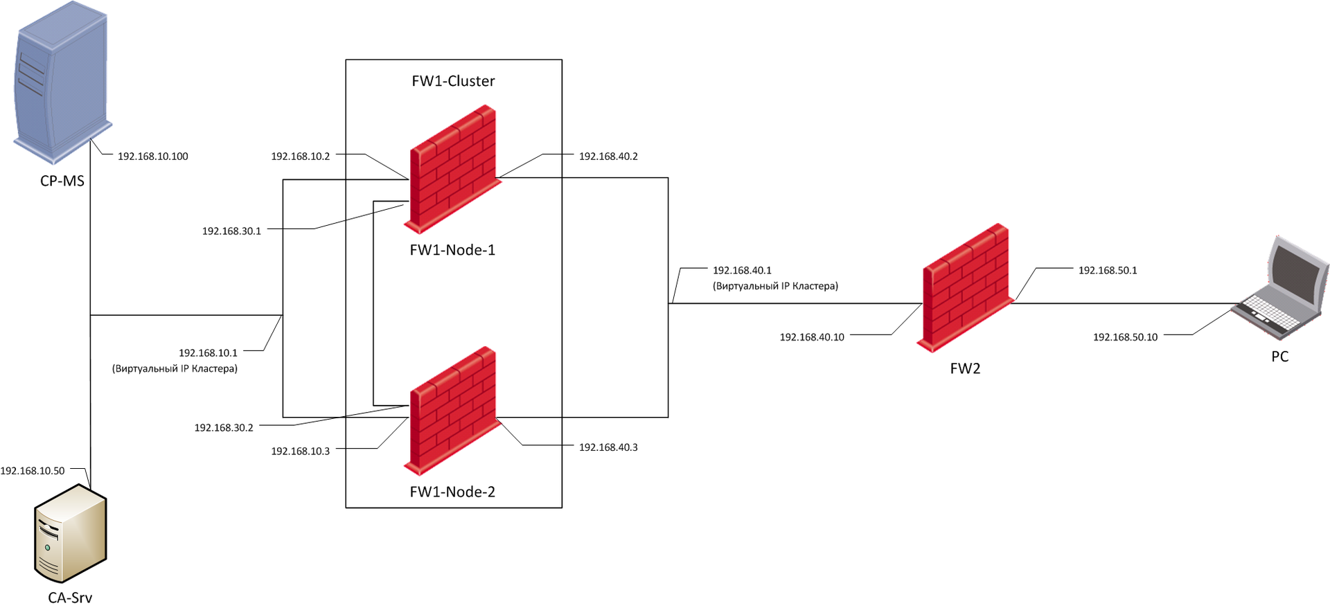 | FW1-Node-1 | Check Point Gaia R75.40VS | Шлюз Check Point (Security gateway), член кластера FW1-Cluster, режим работы кластера: Multicast load sharing |