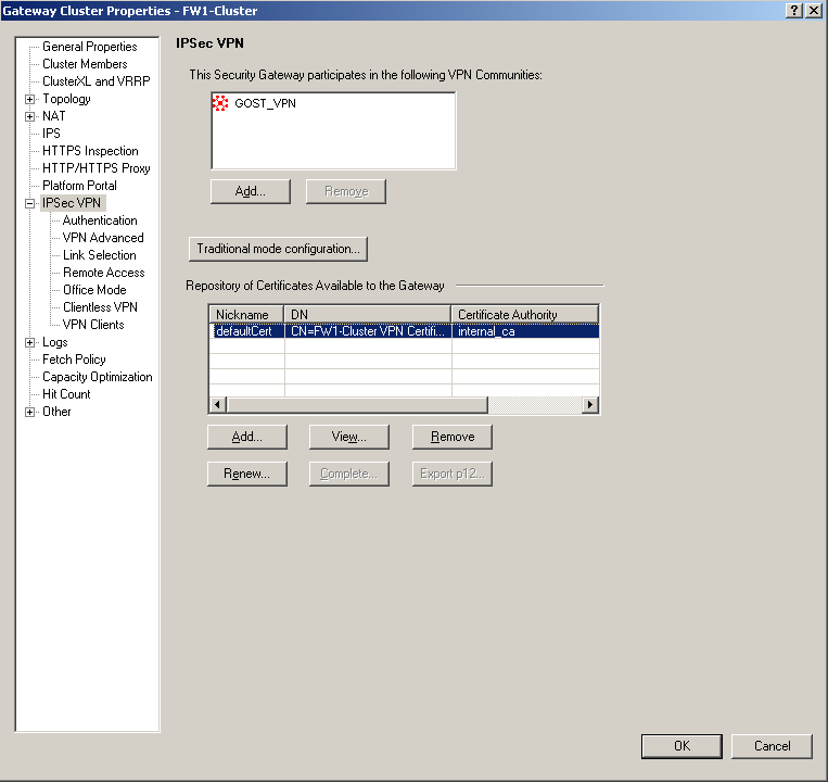 • Открыть окно свойств объекта шлюза, в разделе «IPSec VPN» в графе «Repository of Certificates Available to the Gateway» выбрать сертификат, выданный шлюзу внутренним центром сертификации (Check Point internal_ca), и нажать кнопку «View»;