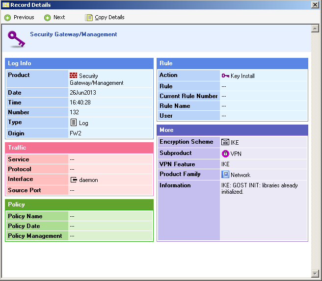 12) Теперь можно установить политики на шлюзы и проверить логи на предмет того, что VPN успешно собрался. В логах должны присутствовать сообщения об успешной установке Site Key или Site Certificate и инициализации криптобиблиотек и сообщения типов Encrypt/Decrypt для трафика, передаваемого через VPN соединение. Примеры сообщений: