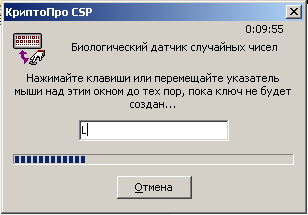 3) На «правильном» АРМ выработки внешней гаммы используется аппаратный датчик псевдослучайных чисел, входящий в состав электронного замка «Соболь», в тестовом случае используется биологический датчик псевдослучайных чисел и Вам будет предложено понажимать на клавиши или поводить мышью, выглядит это так: