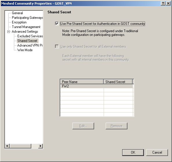 6) Установить в настройках VPN Community использование пароля для аутентификации. Делается это в свойствах VPN Community в разделе «Advanced Settings», пункт «Shared Secret»: