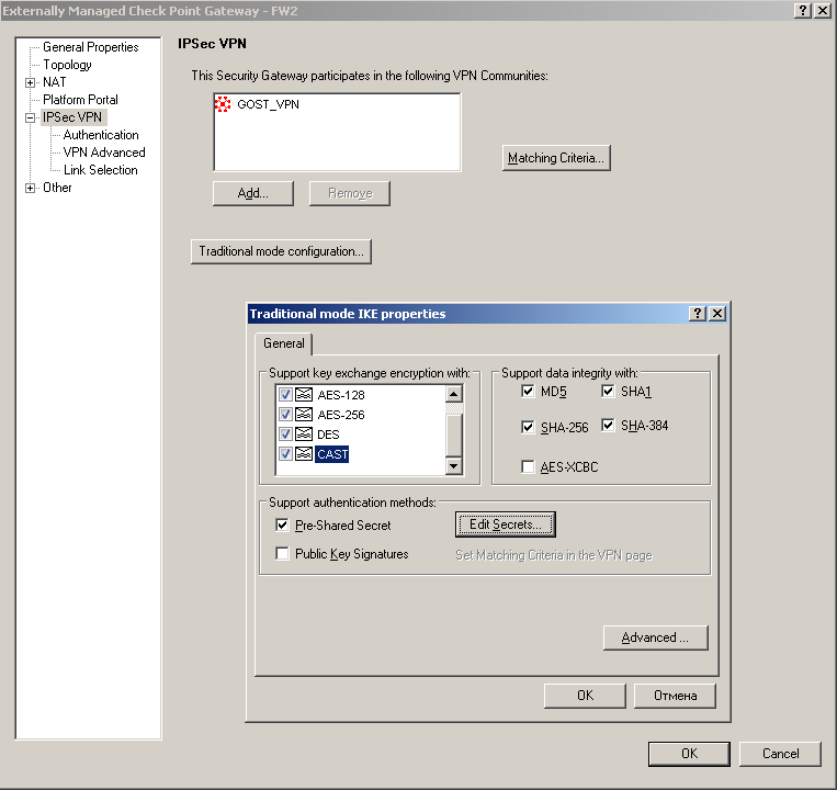 5) Настроить VPN Community на использование ГОСТового шифрования: