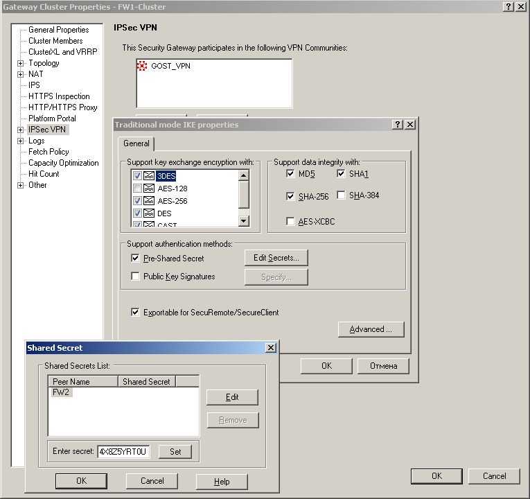 • После того как у вас появился Site Key, его необходимо внести в конфигурацию кластера. Откройте окно свойств объекта кластера, раздел «IPSec VPN», графа «VPN Advanced» и нажмите кнопку «Pre-Shared Secret» в разделе «GOST Standard»: