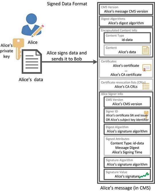 Подписанное Алисой сообщение в формате CMS будет иметь следующий вид (серым отмечены необязательные атрибуты):