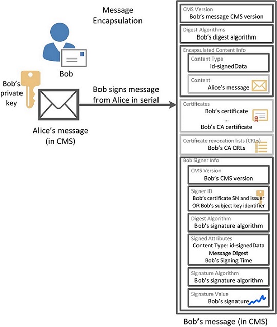 Если Боб решает целиком подписать полученное от Алисы сообщение, то используется механизм инкапсуляции, и сообщение будет выглядеть вот так: