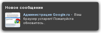 Открываю сегодня утром ВКонтактик в Chrome, открытым в линуксахзапущенным, и тут мне через каждую секунду в левый нижний угол (прям как новое личное сообщение) начинает падать одно и то же сообщение от некой «Администрации Гугл.ру» с «просьбой» обновить мой браузер: