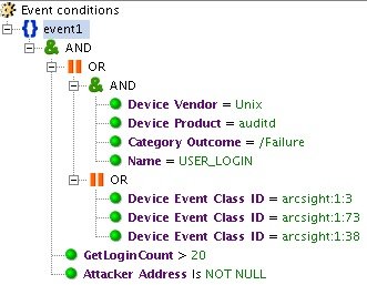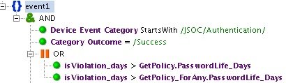 В качестве примера приведем правило «INC_Password Change Needed». Его основная задача – оповещать, если произошла аутентификация в системе под учетной записью с просроченным паролем. Период вычисляется по корпоративным правилам и разнится в зависимости от заказчика. В данном правиле используются категоризация JSOC «Device Event Category starts with /JSOC/Authentication/», которая включает в себя все события аутентификации с различных источников, и стандартная категоризация «HP Arcsight – Category Outcome =/Success» – успешное событие подключения.
