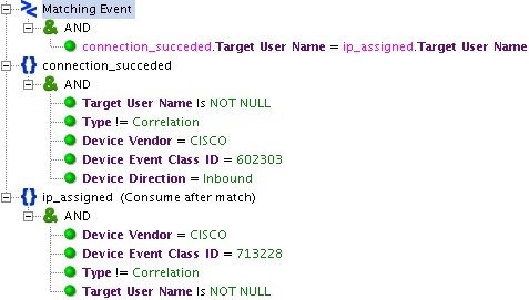 Ярким примером использования базовых правил является «CISCO_VPN_User Session Started». Это правило позволяет связать IP-адрес сотрудника, подключающегося по VPN, с его именем пользователя (данная информация находится в разных событиях, приходящих с Cisco ASA).