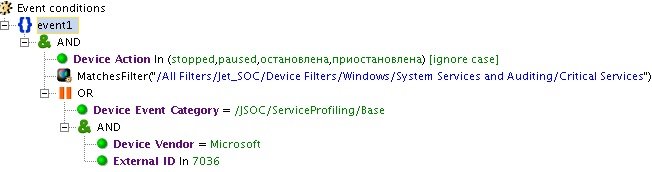 При остановке критичной службы на отслеживаемом сервере происходит срабатывание правила «INC_Critical Service Stopped». Это событие может говорить о злонамеренных действиях пользователя или вредоносного ПО. Но большинство направленных атак на компанию, а также внутренних инцидентов невозможно идентифицировать по одиночному событию.