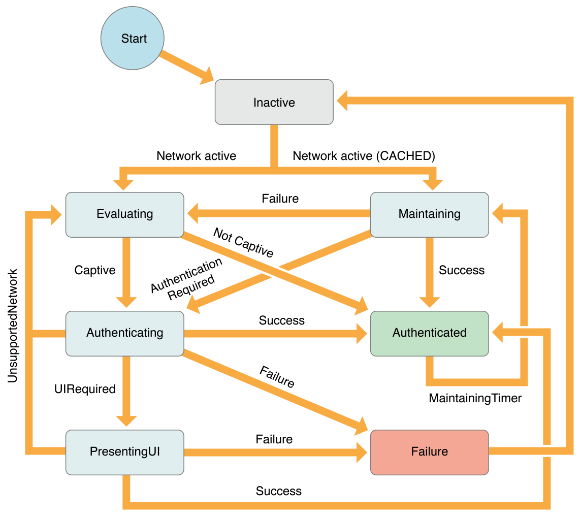 - потребует повторной авторизации, вызвав response с результатом .authenticationRequired (в этом случае StateMachine переходит в состояние Authenticating и посылает Hotspot Helper команду authenticate).