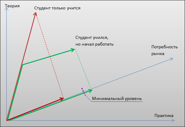 Студенты, которые видят мир так же, как и работодатели — идут работать в ущерб учебе. Они не только видят, что то, чему учат, не совпадает с потребностью рынка, но и замечают некоторый минимальный уровень, который нужен, чтобы стать востребованным специалистом на рынке труда. Минимальный уровень навыков не всегда ярко выражен, но почти всегда присутствует.