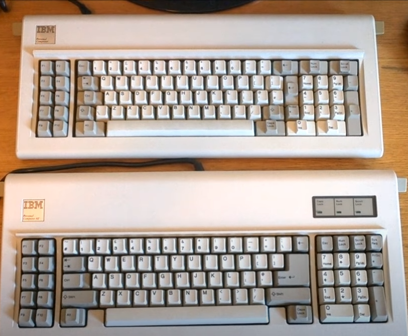Самые успешные из первых производителей ПК — Apple, Commodore, Tandy Radio Shack — нацеливались на аудиторию «технологических энтузиастов»; но IBM, вдохновившись успехом первопроходцев, задумала персональный компьютер для офисных работников, привыкших ко клавиатуре Selectric. Тем не менее, клавиатура первого IBM PC (1981) на Selectric похожа мало: клавиши, втиснутые в тесный прямоугольник, лишились своих характерных форм; на Enter и Shift даже не поместились подписи! Может быть, какие-то технологические проблемы помешали IBM в 1981 выпустить клавиатуру на пару дюймов шире, где клавиши не пришлось бы так ужимать? Такая клавиатура действительно вышла с IBM AT в 1984: Enter снова «Г вверх ногами», а Ctrl, Alt и Caps Lock приняли форму, используемую в Selectric и в VT100 для Caps Lock и Shift.