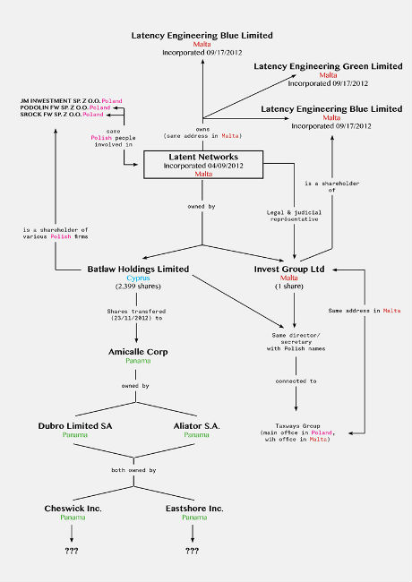 В то время (была примерно середина июля) я нашел эту компанию в официальном Бюро регистраций компаний Мальты, но единственное, что я раскопал – это название фирмы и ее ID; если бы я потратил кучу денег, то смог бы приобрести «свидетельство о регистрации», где я думал найти имена владельцев компании… но вместо них я неожиданно перескочил с Мальты на Кипр и Панаму. Вкратце: Latent Networks Limited была зарегистрирована 4 сентября 2012 года на Мальте и располагалась в Слиме. Управляющим делами фирмы был человек с польским именем Кржиштоф Кубала, работающий в компании под названием Taxways Group. Адрес Taxways Group на Мальте совпадает с адресом Latent, но главный офис Taxways расположен в Варшаве. В свидетельстве о регистрации Latent упоминается еще одна компания под названием Alter Domus (милое название для компании из налогового убежища).