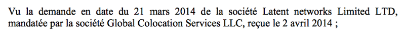Я не сильно задумывался о Latent, когда пытался составить свою карту линий связи (я лишь думал, что система SuperMontage в налоговых убежищах – это довольно необычно), но в итоге чисто случайно я кое-что нашел. В какой-то момент я решил проверить все французские лицензии, дающие разрешение на пересечение границы (Франция-Англия и Франция-Бельгия), так как хотел убедиться, не упустил ли я из вида какую-нибудь неизвестную организацию. Так я нашел документ, который нельзя обнаружить, если искать по названию «Latent» на веб-сайте ARCEP. Документ находится здесь. Это последняя лицензия, выданная компании Latent Networks 29 февраля 2014 года, но заявка подана не фирмой Latent; имя подавшей заявку компании – «Global Colocation Services LLC». Другими словами, это довольно хорошо известная фирма из Чикаго под названием… Getco.