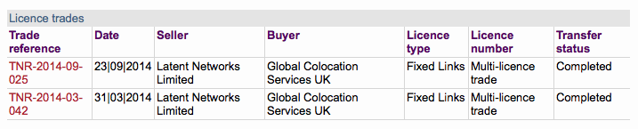 Несколько дней спустя я обнаружил французскую лицензию на имя «Latent Networks» и «Global Colocation Services»; я догадался, что Latent продали две британские лицензии Getco 31 марта 2014 года. Две эти лицензии Latent Networks приобрели, чтобы пересечь канал с Тур де Руз в Дюнкерке до Дувра в Великобритании (что согласуется с французской лицензией). Две недели назад сайт Ofcom был отключен из-за обновления сервера, но когда он снова заработал… каково было мое удивление, когда я увидел, что 23 сентября 2014 года Latent продал свои лицензии Getco: