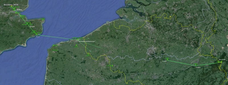 Полагаю, это было причиной регистрации Global Colocation Services LLC еще и в Великобритании. Если сравните номера лицензий Latent с номерами лицензий, проданных Getco, то быстро догадаетесь, что Latent продали Getco весь путь от Тур де Руз до дата-центра NYSE в Базилдоне (на этот раз я уверен, что эти зафиксированные на моей карте маршруты точны на 100%;). Здесь показана сеть Latent-Getco из Германии в Базилдон. Я знаю, некоторые вышки в Бельгии не указаны, но общедоступных данных в моей стране нет, поэтому не знаю, где Latent могли бы установить свои «тарелки» между Тур де Руз в Дюнкерке и Энкуром в Бельгии (я не обозначал пункты, соответствующие нескольким старым вышкам, которые Latent больше не использует):