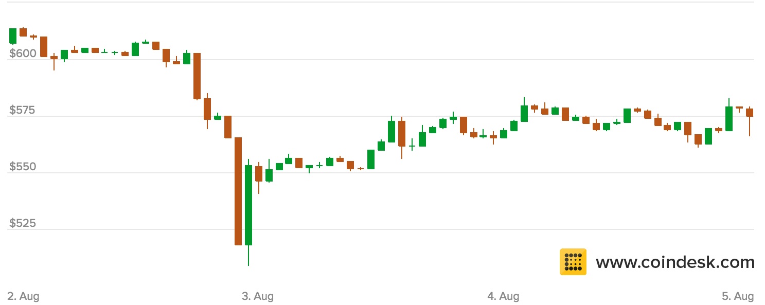 Состоявшийся 2 августа хак биржи Bitfinex, завершившийся уводом 120 тысяч биткоинов стал самым тяжёлым ударом по стоимости криптовалюты в уходящем году, приведя к обвалу с $607,37 до $480 за один день. Впрочем, к 4 августа цены вернулись на уровень $580.