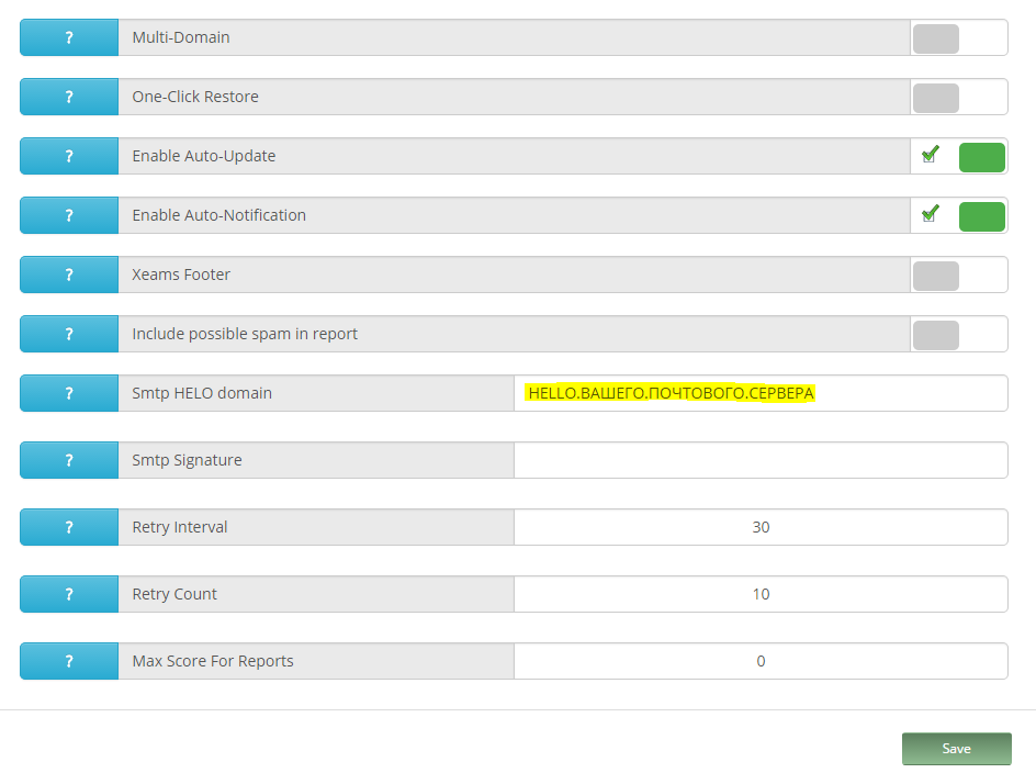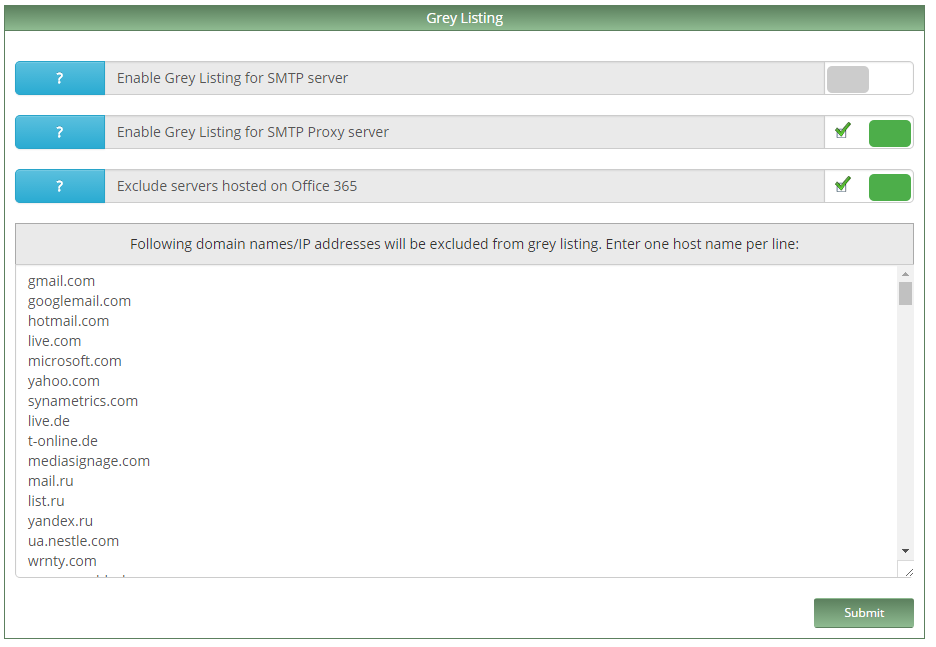 . Настоятельно рекомендую прописать туда все домены публичной почты и белого списка, потому что задержка письма на 10 часов из-за неправильно настройки на стороне отправляющего почтового сервера, увы, не редкость.