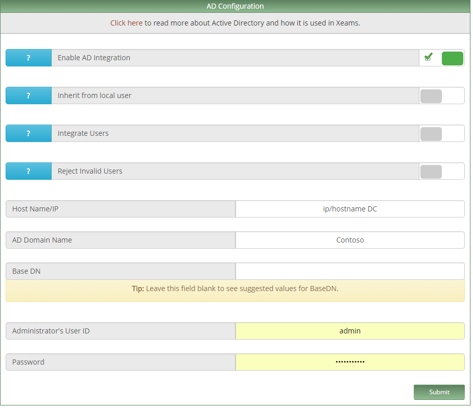 Если у Вас поднят Active Directory, то его без проблем можно интегрировать в Xeams. Зачем? Хотя бы для того, чтобы пользователи не мучали Вас в первое время, что у них не доходит почта. Пользователь без проблем сможет зайти и проверить свой почтовый ящик, просмотреть свой спам и прописать свои black/whitelist: