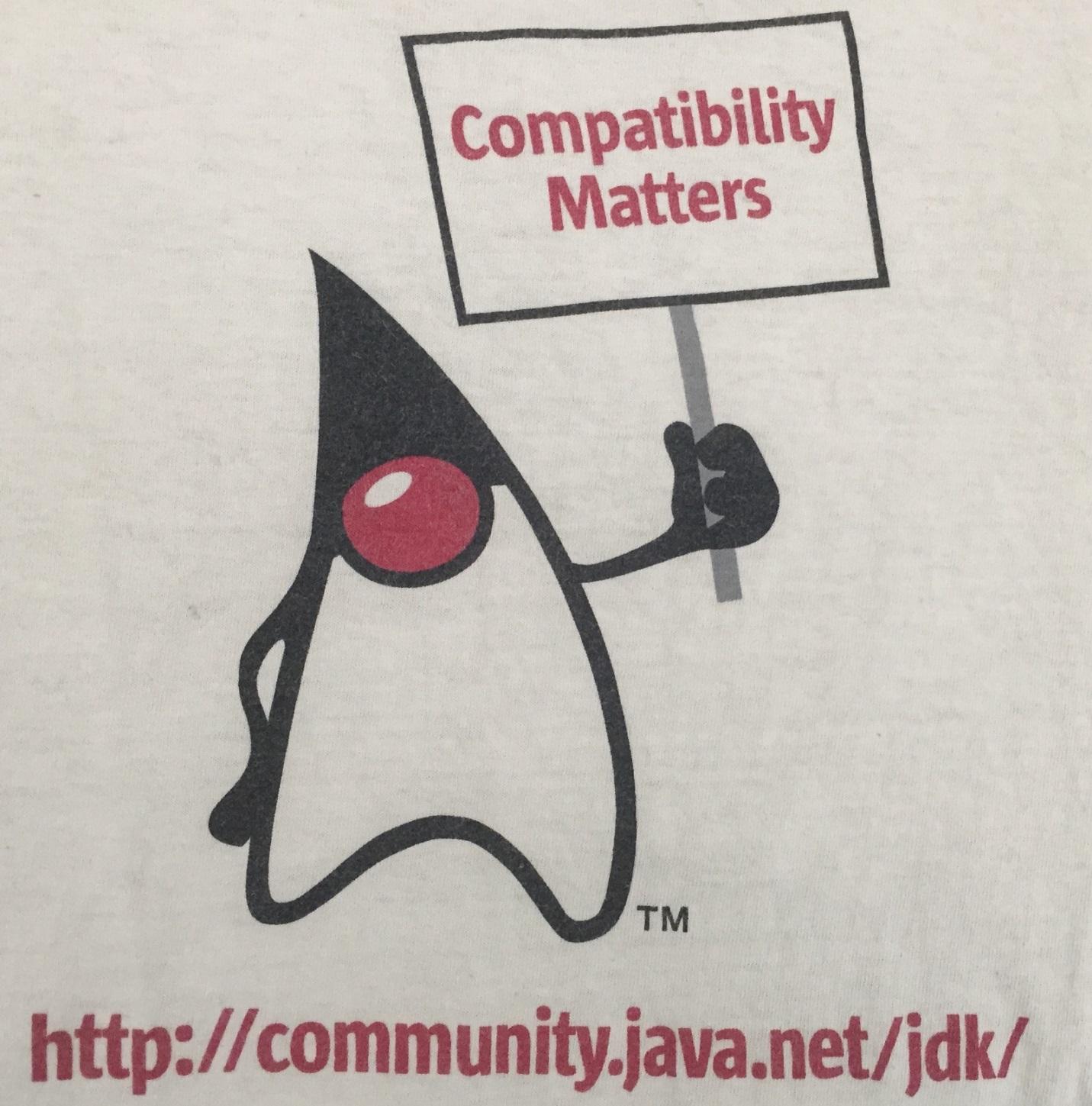 Слоган «Compatibility Matters» скрывал в себе замечательную идею, в соответствии с которой важнейшей особенностью платформы Java была обратная совместимость. Мы относились к этому серьёзно, нанося на футболки изображения подобные тому, которое вы можете видеть ниже.