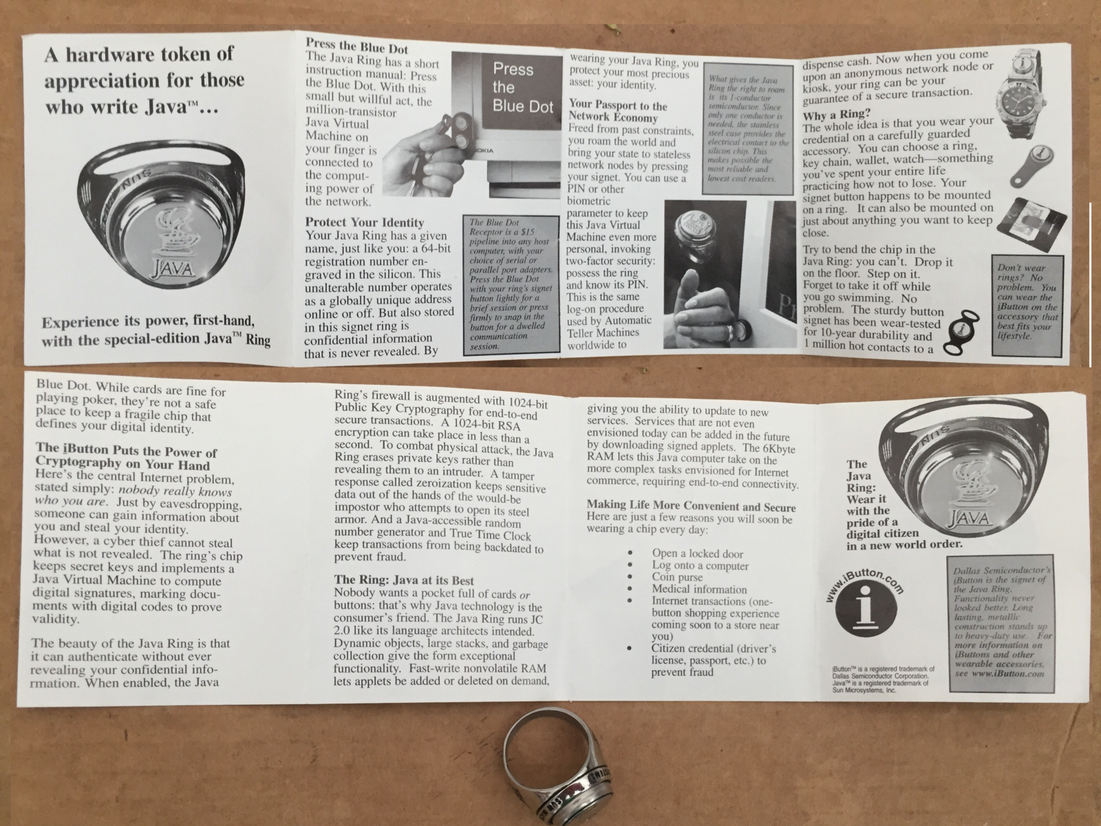 Вот фотография кольца Java, которое как-то раздавали на конференции JavaONE. Такие кольца содержали чип с полной реализацией Java на борту. Их, в основном, использовали для разблокировки компьютеров, установленных в вестибюле.