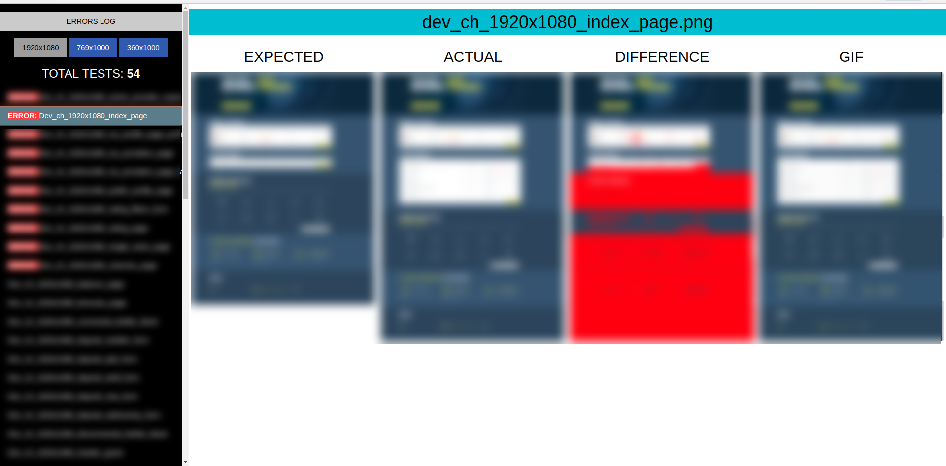 - Генератор отчетов — для каждого теста создается по 4 скриншота — актуальный, ожидаемый, разница, гиф. Если ожидаемых скриншотов нет, актуальные скриншоты будут сохранены как ожидаемые.